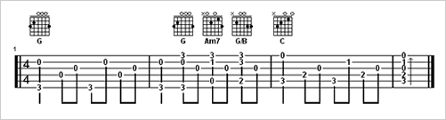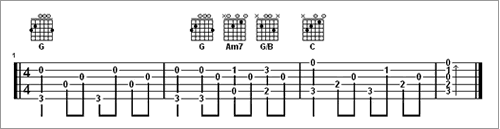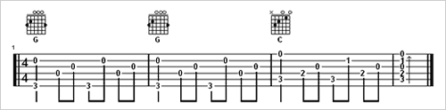 一般常用開放和弦的有 C, G, D, A, E調及其關係調。首先我們以G調配合三指法為例子。當 G和弦進入到 C和弦時,它的標準進行如下: