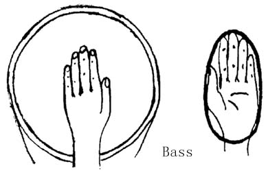 Bass:djembe 的低音。要打出 bass 音切記不要很刻意用力重?fù)艄拿,手要輕松柔軟,掌面持平,否則不是產(chǎn)生不該有的雜音,就是會(huì)使 bass 音不自然的斷音。肩頸放輕,手臂外伸,手肘微微往身體內(nèi)彎,手掌和前臂成一直線,手指自然伸直,大拇指外張,拍打鼓面時(shí)要干脆不拖泥帶水,手掌拍擊鼓面后立即彈起。拍擊的位置大概是整個(gè)手掌 ( 除大拇指外 ) 能在鼓面內(nèi)緣即可,不用力求掌心非得拍擊鼓面中心點(diǎn)。每個(gè)鼓的特性不同,不同的手法及擊點(diǎn)都會(huì)產(chǎn)生不同的音,所以只要你打出的 bass 音滿圓潤(rùn),大概就沒錯(cuò)了。