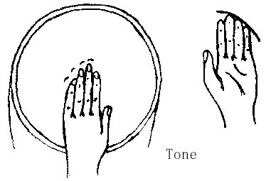 Tone:djembe 的中音。打 tone 音的時(shí)候,打法基本上跟打 bass 的打法差不多,不過打在鼓面的位置是不同的,所打的位置是在鼓面的邊緣,以手指和掌心的交接線貼近鼓面的邊緣,而且大拇外張,其余四指并攏。也和打 bass 時(shí)一樣,要干脆,四指指腹切實(shí)擊在鼓面上,一接觸后,立即彈起,就像觸摸到一個(gè)火燙的火爐一般。