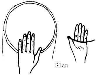 Slap:djembe 的高音。打 slap 音和 tone 音的位置幾乎是一樣的,都是在鼓面的邊緣,但是四指自然松開,與手掌部位形成自然彎曲 ( 有老師沒強(qiáng)調(diào)這點(diǎn) ) ,由外而內(nèi)稍帶角度 ( 另有老師認(rèn)為直上直下即可 ) ,以手指和掌心的交接線,打擊鼓面的邊緣,讓指端迅速地敲打在鼓面上,而發(fā)出鐘聲般的聲音。 Slap 這個(gè)音的手法有比較多的不同論述,以 mamady 及 famoudou 來講,就有所不同,不過相同的是他們打出的 slap ,就是「猛」、「清脆悅耳」、「聲音大港」,我想能打出那種聲音的手法,就是正確的手法。