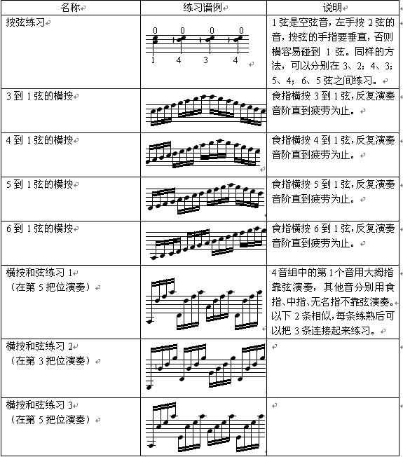 a、在第一把位中練習(xí)食指同時(shí)按下第一品中的高音三根弦。注意大拇指不要與食指處在同一位置,大拇指處在與中指相對(duì)位置的附近,以與食指形成一定的力矩,讓食指能發(fā)揮“扳”的功能,這樣就增加了按在弦上的能量。不過要注意把食指伸展開來,以免弦躲在了關(guān)節(jié)的內(nèi)凹處。接著用同樣的方法練習(xí)四根弦、五根弦直至橫按六根弦。