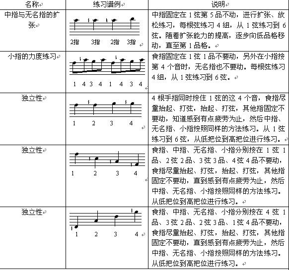 二、左手機(jī)能的訓(xùn)練。有人覺得自己的橫按能力不夠,就一味的練習(xí)橫按;有人覺得圓滑音不好,便一味的苦練圓滑音,結(jié)果花了大量時(shí)間練習(xí),效果卻很不理想。主要原因便是左手機(jī)能不夠所致。左手機(jī)能主要包括手指關(guān)節(jié)的力量、各指的獨(dú)立性、擴(kuò)張能力等。不具備一定的基礎(chǔ)能力,不要說進(jìn)行橫按、圓滑音、快速換把等困難重重,即使是要想做到很好的單指按弦都會(huì)力不從心。因此,在最初的練習(xí)中就加強(qiáng)這方面的訓(xùn)練是非常必要的。