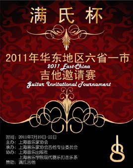 『2011 年華東地區(qū)“滿氏杯”古典吉他邀請賽』把音樂會、比賽、講座、等活動結(jié)合在一起。由上海音樂家協(xié)會主辦,上海音樂家協(xié)會吉他專業(yè)委員會主承辦,上海音樂出版社、上海音樂學(xué)院現(xiàn)代器樂與打擊樂系等單位協(xié)辦,滿氏吉他獨家贊助。