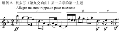 音樂是情感的藝術(shù),音樂藝術(shù)總是與非邏輯的本能、感性、情感、欲望、非理性等相關(guān),音樂的創(chuàng)作、表演和欣賞需要以人的情感活動(dòng)作為基礎(chǔ),西方音樂藝術(shù)在內(nèi)容與形式上都體現(xiàn)出非理性特征。古希臘哲學(xué)家就認(rèn)為音響本身具有情緒的意義,音樂具有消遣功能和享樂價(jià)值。盡管中世紀(jì)宗教音樂理性化的結(jié)構(gòu)形式超過了情感表達(dá)的需要,但人性始終想沖破宗教的束縛從而獲得感性和精神上的自由。巴洛克時(shí)期的作曲家努力用音樂喚起人的情感,音樂理論領(lǐng)域“情感論”的高漲體現(xiàn)了音樂的非理性因素,巴洛克早期音樂的精髓就是即興演奏,在確立通奏低音的主調(diào)織體后,使用無準(zhǔn)備的裝飾音,或者使用非正規(guī)的解決,或者用加花變奏做即興處理,即興演奏體現(xiàn)了音樂非理性的特征。貝多芬的《d小調(diào)第九交響曲》第一樂章用一種嚴(yán)肅、宏大的氣勢(shì)來表現(xiàn),旋律跌宕起伏,時(shí)而壓抑、時(shí)而悲壯。第一樂章的第一主題(譜例2)最開始在低沉壓抑的氣氛下由弦樂部分奏出,而后逐漸加強(qiáng),直至整個(gè)樂隊(duì)奏出威嚴(yán)有力,排山倒海式的全部主題,該主題由α、β、γ三個(gè)因素構(gòu)成,悲愴、莊嚴(yán)、鮮明且具有號(hào)召性,有不畏強(qiáng)暴、堅(jiān)持反抗的精神,該主題嚴(yán)峻有力,表現(xiàn)了艱苦斗爭(zhēng)的形象,充滿了巨大的震撼力和悲壯的色彩,這體現(xiàn)了音樂非理性的內(nèi)容。