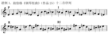 勛伯格的《鋼琴組曲》(作品25)體現(xiàn)了高度的形式理性,該作品用于創(chuàng)作的音列有四種(譜例1):分別是原音列(P),音列的轉(zhuǎn)位(I),音列的逆行(R),音列的逆行轉(zhuǎn)位(RI),根據(jù)這四種音列作成的樂曲片段,幾個(gè)聲部作卡農(nóng)式的模仿或反行模仿,這是一首無調(diào)性的十二音音樂。十二音音樂以數(shù)學(xué)的方法對(duì)音符進(jìn)行科學(xué)運(yùn)算,它是基于數(shù)理邏輯與理性化的一種無調(diào)性的技術(shù)手法,并且按照一定邏輯去排列,以一種極端理性化的形式出現(xiàn),它后來發(fā)展成為序列主義音樂,序列主義音樂把對(duì)音級(jí)的序列安排和控制擴(kuò)展到節(jié)奏、音色、動(dòng)力等其它方面,并將其與理性進(jìn)一步緊密結(jié)合,音樂創(chuàng)作成了物理音響參數(shù)的數(shù)學(xué)組合,被有序的、形式主義的觀念所壟斷,最終形成了在形式上極端理性的音樂。