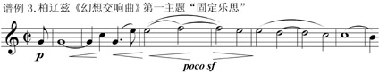 十九世紀(jì)法國(guó)大革命失敗之后,理性受到了懷疑和否定。在對(duì)黑格爾的批判中,產(chǎn)生了以叔本華唯意志論為代表的西方非理性主義思潮,非理性主義是一個(gè)歷史性概念,它是指反對(duì)理性主義基本原則的哲學(xué)思想和社會(huì)思潮。 [[2]]74-76尼采是非理性主義者的代表人物,其“上帝死了”的思辨,包含著人類對(duì)理性力量的懷疑,尼采與瓦格納最初都倡導(dǎo)狄俄尼索斯式的悲劇世界觀,瓦格納音樂作品中的英雄人物甚至是尼采“超人”的原型,瓦格納后來背離了人可以通過自己的行動(dòng)改造世界的信念,尼采與瓦格納最終走向決裂。十九世紀(jì)是一個(gè)激烈變化的時(shí)期,浪漫主義音樂高度個(gè)性化,音樂家們感到極度失望、苦悶和無助,開始逃避現(xiàn)實(shí)而沉浸在主觀幻想的情感世界中,將感情和想象提到音樂表現(xiàn)的重要位置,甚至將情感置于理性之上。受非理性主義思潮的影響,浪漫主義時(shí)期的音樂具有突出的非理性特征,它強(qiáng)烈地反叛一切“理性”的束縛,其精神實(shí)質(zhì)是強(qiáng)調(diào)“人”及其本性,突出“個(gè)人”是感情的焦點(diǎn)與幻想的主體。浪漫主義音樂肯定個(gè)人情感,蔑視形式主義,反對(duì)理性崇拜。柏遼茲的《幻想交響曲》在形式上擺脫了古典交響曲的束縛,它獨(dú)創(chuàng)性地運(yùn)用半自傳式標(biāo)題,把精神意象轉(zhuǎn)化為聲音,創(chuàng)作出充滿不可遏制力量的音樂,這是構(gòu)思狂放的、直覺的音樂。柏遼茲具有多愁善感的性格,他對(duì)人和生活的意義持絕望的態(tài)度,其《幻想交響曲》從夢(mèng)(無意識(shí))中汲取題材,表現(xiàn)出鮮明的非理性特征,該作品的副標(biāo)題是“一個(gè)藝術(shù)家的生活片斷”,五個(gè)樂章通過文學(xué)標(biāo)題展現(xiàn)給聽眾,《幻想交響曲》第一樂章“夢(mèng)與熱情”,形式上是較長(zhǎng)的慢板序奏,用以表現(xiàn)年輕藝術(shù)家尚未遇見心上人之前,內(nèi)心的不安與憧憬,第一樂章的主部主題也稱為固定樂思(譜例3),它在其它四個(gè)樂章中以不同的形態(tài)變?cè)佻F(xiàn),揭示了主人公心理和情緒的變化,《幻想交響曲》的音樂內(nèi)容體現(xiàn)了非理性特征。