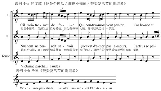 神學(xué)占統(tǒng)治地位的中世紀(jì),音樂中的感情表現(xiàn)受到遏制,宗教音樂的結(jié)構(gòu)形式超過了情感表達(dá)的需要,但依然體現(xiàn)了理性與非理性的對(duì)立統(tǒng)一。譜例4-a是經(jīng)文歌《他是個(gè)傻瓜/誰也不知道/贊美復(fù)活節(jié)的殉道者》, [[3]]459低音聲部(Tenor)使用了圣詠的旋律(譜例4-b圣詠《贊美復(fù)活節(jié)的殉道者》),圣詠貫穿該作品始終,格里高利圣詠是用教會(huì)調(diào)式寫作的單聲部旋律,來自圣經(jīng)的歌詞是同上帝交流的媒介,充分體現(xiàn)著宗教理性,但高音聲部Ⅰ與高音聲部Ⅱ的歌詞卻是世俗的愛情內(nèi)容,非宗教性旋律也是獨(dú)立創(chuàng)作的,這體現(xiàn)理性與非理性的對(duì)立統(tǒng)一。另外,教會(huì)調(diào)式以五度相生律為基礎(chǔ),感性本能向以自然泛音為基礎(chǔ)的純律滑去,五度相生律最終被純律所取代,教會(huì)調(diào)式最終被大小調(diào)式體系所取代,這一現(xiàn)象的背后是感性與理性的沖突,大小調(diào)式體系的勝利是感性沖破理性束縛的勝利。
