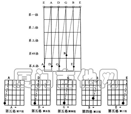 同度調(diào)弦法:即同音異弦。調(diào)整第①弦的音高,用音叉確定第①弦的音高為E(Mi);調(diào)整第②弦的音高,按第②弦第5品位所發(fā)的音高與第①弦空弦的音高E(Mi)相同;調(diào)整第③弦的音高,按第③弦第4品位所發(fā)的音高與第②弦空弦的音高B(Si)相同;調(diào)整第④弦的音高,按第④弦第5品位所發(fā)的音高與第③弦空弦的音高G(Sol)相同;調(diào)整第⑤弦的音高,按第⑤弦第5品位所發(fā)的音高與第④弦空弦的音高D(Re)相同;調(diào)整第⑥弦的音高,按第⑥弦第5品位所發(fā)的音高與第⑤弦空弦的音高A(La)相同;