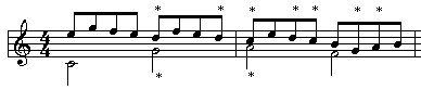 具有一定程度的學(xué)生常常會(huì)對(duì)某些音該用靠弦法還是用勾弦法感到困惑,如上例中帶*的音符。其實(shí)任何事情都不是絕對(duì)的,吉他也不例外。規(guī)則是死的,它僅僅對(duì)大多數(shù)問題比較簡單的情形做出規(guī)定,而音樂則是千變?nèi)f化的,在許多因素綜合在一起時(shí),就要考慮規(guī)則是否適用,是否妨礙音樂的需要。實(shí)際上該用靠弦奏法而不能用的例子是很多的,如上例中帶*的音符,又如分布在相鄰琴弦上的和弦,復(fù)調(diào)音樂中的各個(gè)聲部,速度很快很輕松很活潑的樂句等等。因此,演奏者應(yīng)該順應(yīng)音樂的要求,自己決定如何彈奏。不要擔(dān)心你的選擇和別人的不一樣,不同的演奏者采用不同的奏法是很正常的。