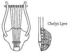 抱琴類,顯然是合乎古希臘傳統(tǒng)的,據(jù)說赫爾墨斯造出里拉琴λυρα贈(zèng)與日神阿波羅時(shí),是三弦的,而阿波羅隨即便添上一弦,使之音域更廣。定型、普及后都是七弦,也有九弦(Theophrastus of Piera)、十弦(Histaeus of Colophon)、十二弦(酒神歌詩人Melanippides)等。傳說俄耳甫斯少年時(shí)候從阿波羅手里接過這抱琴,立即就能演奏,后來這琴被扔進(jìn)河水中,又流落至于阿波羅在Lesbos的神廟,日神請(qǐng)宙斯將之化作星座。最亮的那顆叫做Vega(天琴座α星)。具體區(qū)分,有chelys lyre,χέλυς原意為龜殼,有龜殼蒙上皮革制成的共鳴箱,是唱新婚頌詩epithalamia πιθ λάμιος、以及會(huì)飲和舞會(huì)的女人所持樂器,在婚禮上演奏它的是德高望重婦人,會(huì)飲時(shí)則是由樂妓來擺弄了。