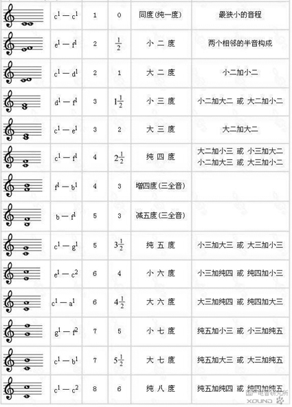 兩音間的高度距離。兩音同時(shí)發(fā)出,稱和聲音程;兩音先后發(fā)出,稱旋律音程。在現(xiàn)有音體系中,相鄰兩音的距離稱半音,兩個(gè)半音為一全音,但習(xí)慣上音程以“度”來計(jì)算。度說明音程所含的音級(jí)數(shù),但不能確切地說明音程性質(zhì),因此音程的名稱必須同時(shí)加上“純、大、小、增、減、倍增、倍減”等詞。在自然七聲音階中 ,do與do本身和從do到上方的fa、sol、do這一、四、五、八度都是純音程。從do到上方的re、mi、la、si這二、三、六、七度都是大音程。比大音程小半音、級(jí)數(shù)相同者為小音程。比純音程、大音程增大半音、級(jí)數(shù)相同者為增音程。比增音程再增大半音、級(jí)數(shù)相同者為倍增音程。比純音程、小音程減少半音、級(jí)數(shù)相同者為減音程。比減音程再減少半音、級(jí)數(shù)相同者為倍減音程。