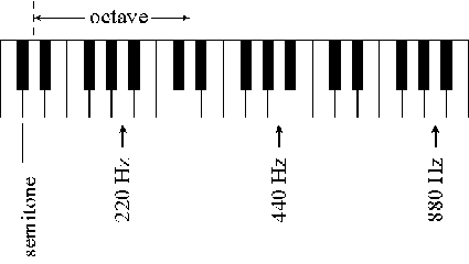 從鋼琴鍵盤上來看,每?jī)蓚(gè)相鄰的鍵盤之間相差一個(gè)「半音」,每?jī)蓚(gè)半音等於一個(gè)「全音」。舉例來說,C與D兩個(gè)白鍵之間夾一個(gè)黑鍵,那就是「#C」,也就是「bD」。則C與D之間相差兩個(gè)半音,即等於相差一個(gè)全音。以吉他而言,指板上每一格代表一個(gè)半音,也就是每按高一格便將音符推高半音。