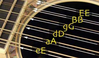 十二弦吉他的琴弦實(shí)際是由六組復(fù)弦組成的,每組兩根琴弦,所用琴弦也和六弦吉他一樣。各組琴弦的定音(由低到高)分別為: 6弦3弦、5弦2弦、4弦1弦、3弦3弦、2弦2弦、1弦1弦。其定弦方法和六弦吉他類似,其中前三組的3弦、2弦、1弦的空弦音分別比6弦E、5弦A、4弦d高八度,而后三組每組的兩根琴弦的空弦音都是同度,分別為:g、b、e1。