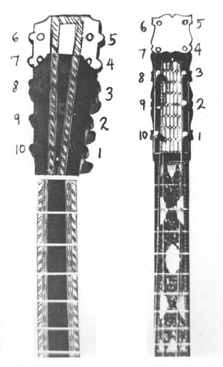 Ten-string, five-course baroque guitars are frequently found truncated and modernized in the manner illustrated here. The ornamentation along the edge of the tuning head usually reveals the original location of the pegs, and suggests where the cut would have been made.