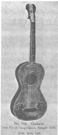 It was a Neapolitan guitar (Catalogue no. 554), identified by the label "Ferdinandus Gagliano Filius Nicolai fecit Neap 1774," and was in the Heyer museum in Cologne before that museum was dispersed. (See Figure 2)