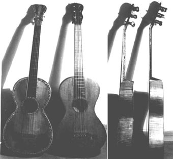 Both the Fabricatore guitar (left) and the Johann Georg Stauffer guitar (right) are in the Sammlung alter Musikinstrumente, Vienna, catalogue numbers 488 and GdM375 respectively. Characteristics: Flush, 11-fret fingerboards, string length 64 cm. for both. The Stauffer (of c.1820) is patterned after the more ornate Italian instrument, dated 1811.