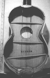 A seventh feature of all guitars from this era was cross-grain bracing beneath the table. This was a definite carryover from the lute, and assured a relatively loud but rapidly decaying sound. Unfortunately, it also resulted in non-uniform swelling and contracting of the wood fibers with changes in humidity, thereby making the likelihood of cracking and deterioration with the changing seasons very great. Figure 6 shows the bracing beneath the table of a Stauffer guitar in just a state of disintegration.