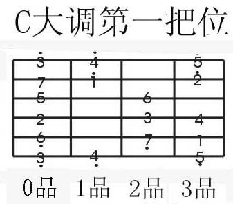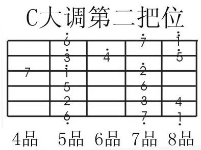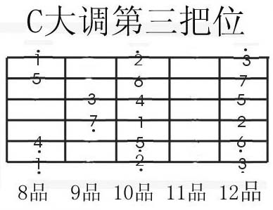 這是C大調(diào)的第三把位。起始于6弦的8品,4根手指分別控制:食指:8品和9品,中指:10品,無(wú)名指:無(wú),小指:12品。