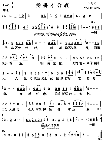 啊,我明白了,歌詞通俗簡(jiǎn)練、曲調(diào)優(yōu)美動(dòng)聽(tīng),更重要的是歌詞充滿了人生哲理。唐代大詩(shī)人自居易說(shuō)過(guò):“文章合為時(shí)而著,詩(shī)歌合為事而作”,歌曲何嘗不是如此!稅(ài)拼才會(huì)贏》是臺(tái)灣的一首流行歌曲,它是在臺(tái)灣市場(chǎng)經(jīng)濟(jì)充分發(fā)展的社會(huì)中應(yīng)運(yùn)而生的。歌曲也是一種文化,文化的傳播是沒(méi)有什么界限的,何況臺(tái)灣與福建只有一水之隔,一陣“風(fēng)”飄來(lái)飄去,文化自然得到交流和融合。更重要的也許是當(dāng)今晉江、石獅改革開(kāi)放的鑼鼓聲震天動(dòng)地,市場(chǎng)經(jīng)濟(jì)空前活躍,空前繁榮,在市場(chǎng)經(jīng)濟(jì)海洋中搏擊的人們,有時(shí)不免掉進(jìn)海中,喝上幾口水。有時(shí)也不免弄得個(gè)家破財(cái)空。本來(lái)嘛,人生的道路就不可能是坦途平川,一帆風(fēng)順,好像是海上的波浪,有時(shí)起有時(shí)落。但是不管如何,尤其是處于逆境之際,不要“怨嘆”,不要“膽寒”,更不要自暴自棄,自愿墮落,像個(gè)“稻草人”。