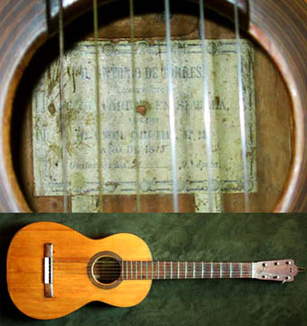 In 1868, Torres married again, wedding Josefa Martín Rosada. Shortly after, Torres met Francisco Tarrega for the first time. Tarrega then a kid of seventeen had come to Sevilla from Barcelona to buy a Torres from the maker of Julían Arcas' instrument. Torres offered him a modest guitar he had in stock, but on hearing him play, offered him a guitar he had made for himself a few years before. About 1870, Don Antonio then in his 50's closed his shop in Sevilla, and moved back to Almería where he and his wife opened up a china and crystal shop on the calle Real. About five years latter, Don Antonio began his "second epoch" as he refers to it on the labels of his guitars, building part-time when not busy in the china shop. After the death of his wife, Josefa, in 1883, Torres began to devote increasing amounts of time to building making some 12 guitars a year until his death in La Cañada de San Urbano, Almería at the age of 75.Torres guitars are divided into two epochs. The first, belonging to Sevilla from 1852-1870; the second, being the years 1871-1893 in Almería. The guitars Torres made were so superior to those of his contemporaries that their example changed the way guitars were built, first in Spain, and then in the rest of the world. Although they are not particularly loud by modern standards, they have a clear, balanced, firm and rounded tone, that projects very well. His guitars were not only widely imitated and copied, but as he never signed his guitars, and only numbered those from his second epoch, over the years many fakes Torres have been made, some made by well-known and expert makers.