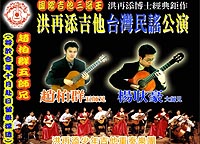國際吉他三冠王——洪再添吉他臺灣民謠公演協(xié)辦單位:洪再添兒童吉他交響樂團。享譽國際的洪再添兒童吉他交響樂團,創(chuàng)團二十年來在本團音樂總監(jiān)洪再添教授的帶領(lǐng)下,一步一腳印茁壯起來,經(jīng)八年間不斷地嘗試,創(chuàng)出一套洪氏教學(xué)法,謂之”實驗期”。接著1994~2001年共八年的”教學(xué)效果印證期”,本團也不斷派出成員參加國際性吉他大賽,成績相當輝煌,于獨奏、重奏、合奏項目皆獲得冠軍紀錄,在國際吉他界及媒體有”國際吉他三冠王”的美譽,同時在2004年完成了九年參賽連年得獎”九年霸”的紀錄。目前本團已發(fā)展至第三階段”留學(xué)人才培養(yǎng)期”,本團與「日本國際新堀藝術(shù)學(xué)院」已達成”建教留學(xué)”的合作。目前本團楊耿豪大師兄已留學(xué)歸國,并在彰化落地生根,推廣洪教授的目標”全民音樂化,生活有音樂”,今年楊耿豪老師將與即將出國留學(xué)深造的師弟-趙柏群以及洪再添少年吉他重奏樂團,以臺灣民謠為主題,演出一系列具有代表性的臺灣民謠-望你早歸、四季紅、望春風(fēng)...并配合古典名曲,帶給您一場難忘的音樂盛宴!。