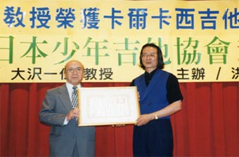 榮獲國際認證推廣吉他教學(xué) 洪再添臺灣第一。我們又多了個臺灣第一的頭銜!由四十三個國家所組成的,『國際吉他交響樂協(xié)會』,頒發(fā)創(chuàng)會以來第一位兒童吉他交響樂教育家的表彰認定書,給臺中市的『洪再添』博士,讓臺灣成為世界上吉他教育最成功的國家.<音樂現(xiàn)場音>... 洪再添博士,以夸張的動作,專注的表情,指揮這個兒童吉他交響樂團,<現(xiàn)場音>,在老師的嚴格調(diào)教下,這個團體屢次獲得國際大獎,而洪再添博士本人也獲得國際吉他交響樂協(xié)會頒贈****教育家的最高榮耀,<現(xiàn)場音>, <洪再添訪問...認真到一個音一世界,來論斷的話,那就仔細的不得了,那種音樂絕對是兢兢戰(zhàn)戰(zhàn)的,我秉持著塑造一個世界級專家來論斷......>,洪再添博士以獨創(chuàng)的音樂造型學(xué),外加呼吸法,身動律動配合法,來教導(dǎo)學(xué)生彈吉他,讓小朋友可以短時間內(nèi)愛上音樂,對于音樂的執(zhí)著,他以一音一世界,來表達對音樂的態(tài)度,五十四歲的洪老師說,未來還是會盡全力來推動吉他教育.