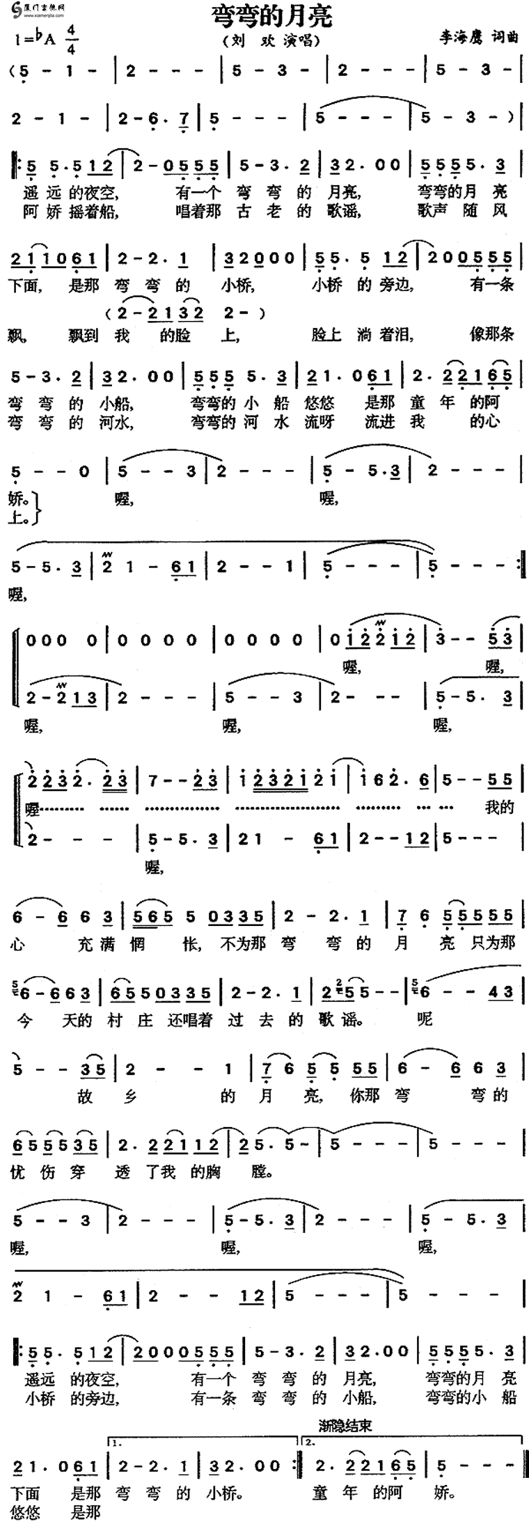 彎彎的月亮(劉歡)簡譜/歌詞/簡介