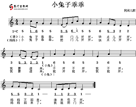 小兔子乖乖(兒歌)五線譜/簡譜/歌詞