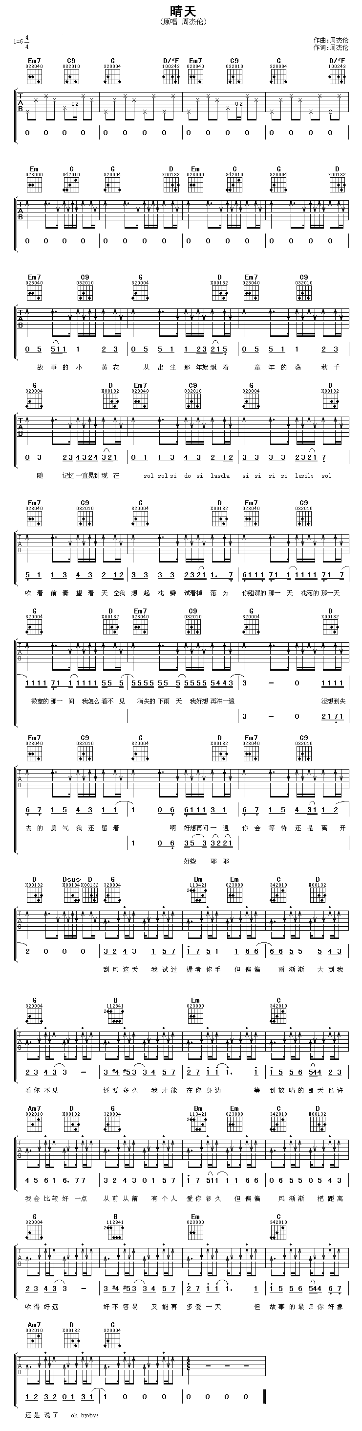 晴天(周杰倫)六線譜/簡(jiǎn)譜/歌詞