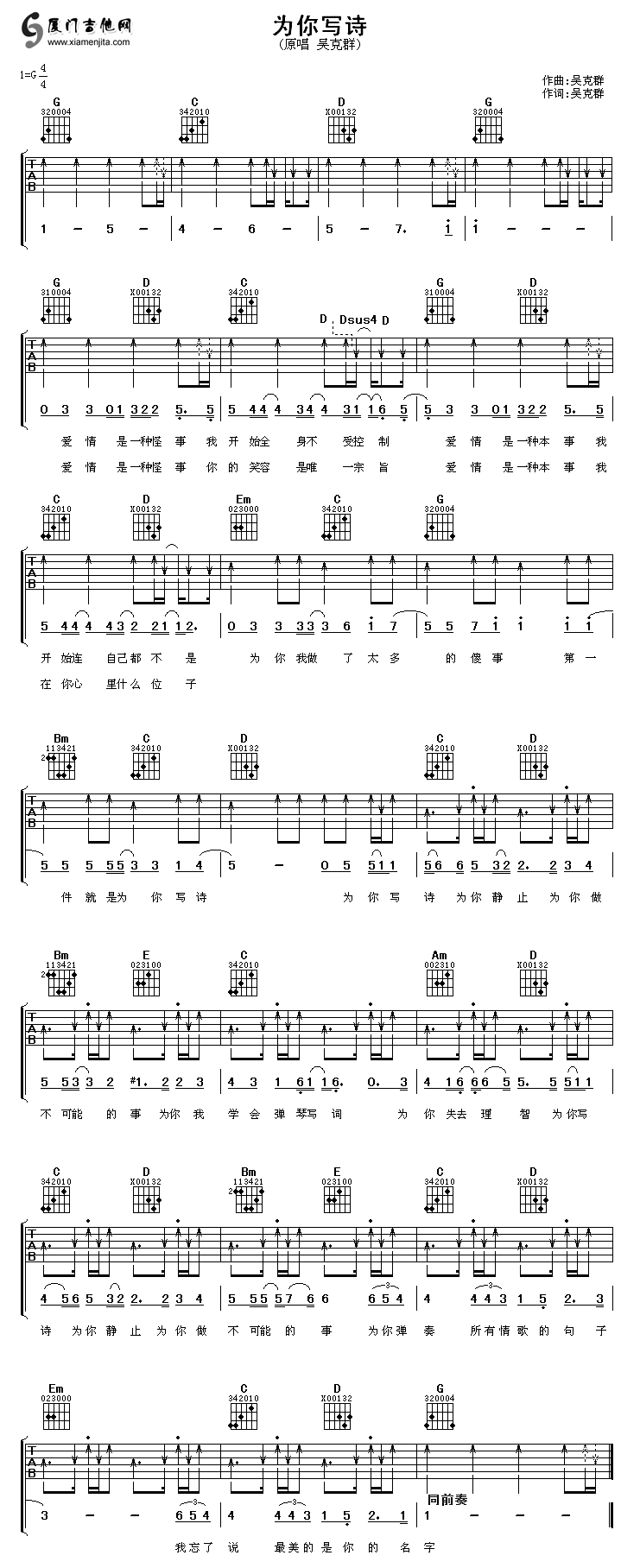 為你寫詩(shī)(吳克群)六線譜/簡(jiǎn)譜/歌詞