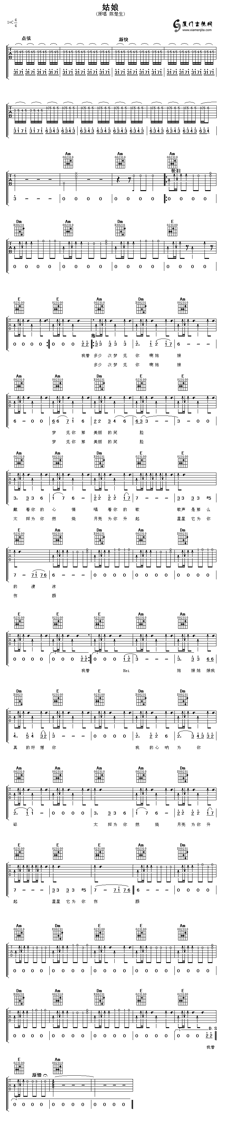 姑娘(陳楚生)六線譜/簡(jiǎn)譜/歌詞