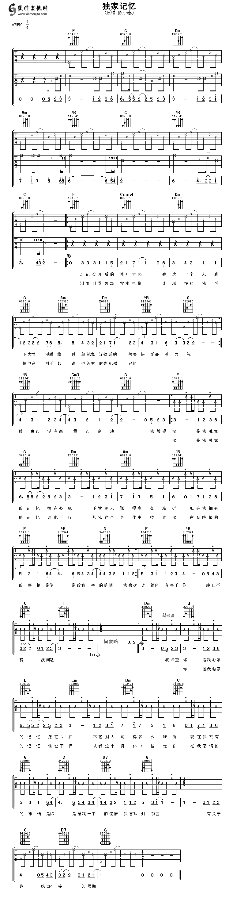 獨(dú)家記憶(陳小春)六線譜/簡(jiǎn)譜/歌詞
