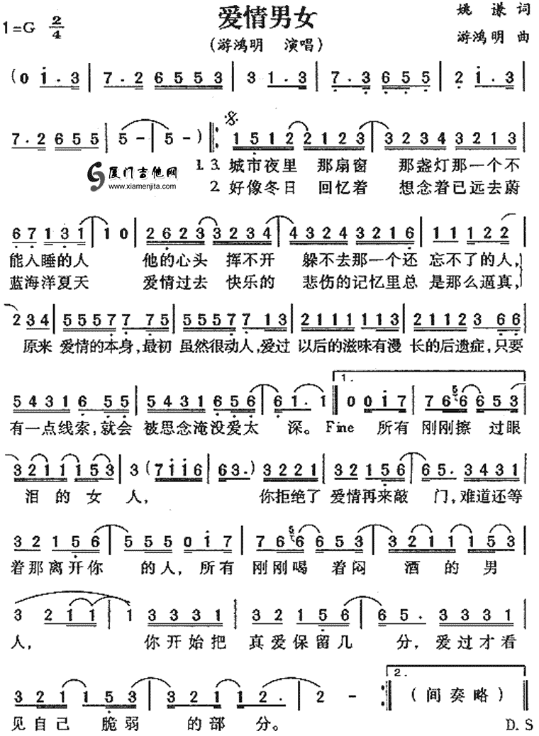 愛情男女(游鴻明) 簡(jiǎn)譜/歌詞