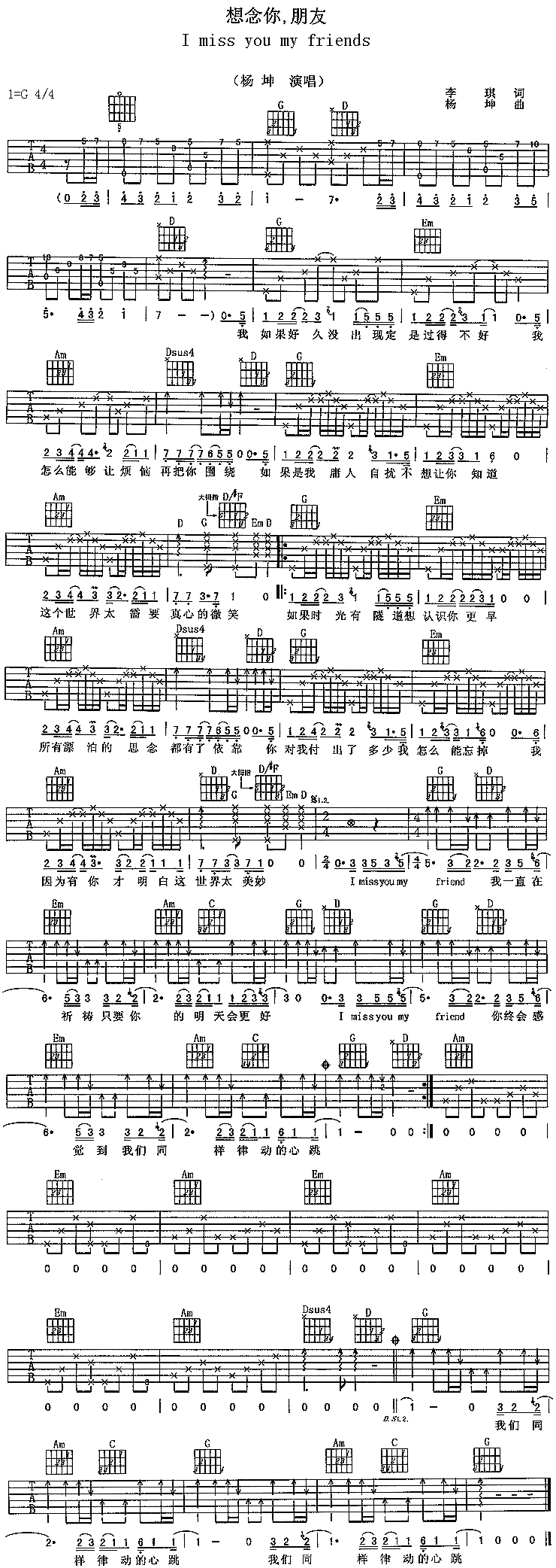 (楊坤)想念你朋友(I miss you) 六線譜/簡(jiǎn)譜/歌詞