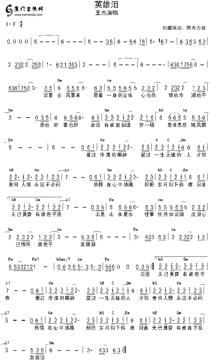 英雄淚(王杰) 簡(jiǎn)譜/歌詞/和弦