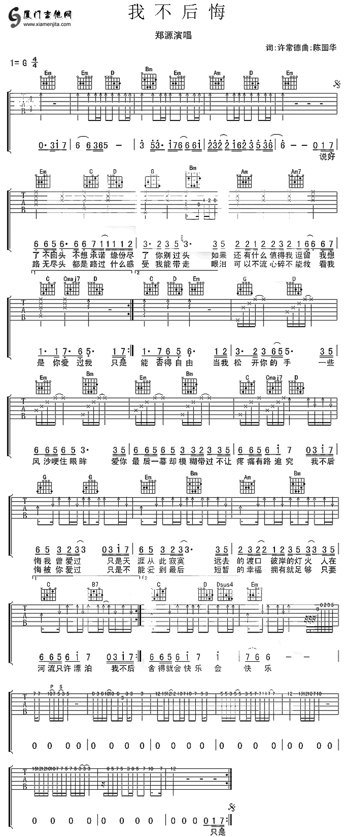 我不后悔(鄭源) 六線譜/簡(jiǎn)譜/歌詞